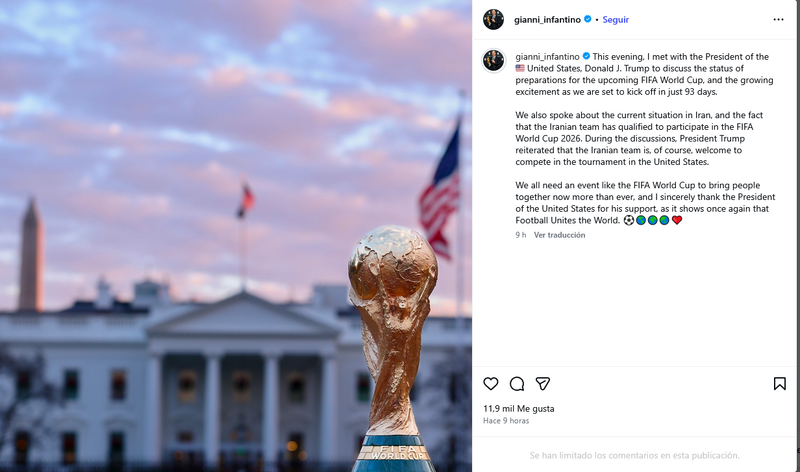 La FIFA, a través de su presidente Gianni Infantino, comentó recientemente que había estado hablando con el presidente de los Estados Unidos, Donald Trump: «Hablé con Trump sobre la situación actual en Irán y el hecho de que el equipo iraní se ha clasificado para participar en la Copa Mundial«. Infantino remarcó que Donald Trump se había mostrado abierto a que Irán participase en el próximo Mundial que se celebrará en Estados Unidos además de México y Canadá: También hablamos sobre la actual situación en Irán, y el hecho de que el equipo iraní se haya clasificado para participar en la Copa del Mundo de la FIFA 2026. Durante la conversación, el presidente Trump reiteró que el equipo iraní es, por supuesto, bienvenido a competir en el torneo en los Estados Unidos«.